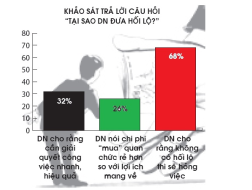 Tiếp đến là người đứng đầu ở một số cơ quan, đơn vị chưa thực thụ vào cuộc nên "mới chỉ đạo chung chung". DN bất kể quy mô lớn nhỏ "bầm dập" trên thương trường đều không xa lạ với "phí lót tay". Đáp câu hỏi "vì sao DN đưa đút lót", 32% DN cho rằng cần giải quyết công việc nhanh, hiệu quả; 26% DN nói hoài "mua" quan chức rẻ hơn so với ích lợi mang về; đáng để ý, có đến 68% DN cho rằng không có đút lót thì sẽ hỏng việc.